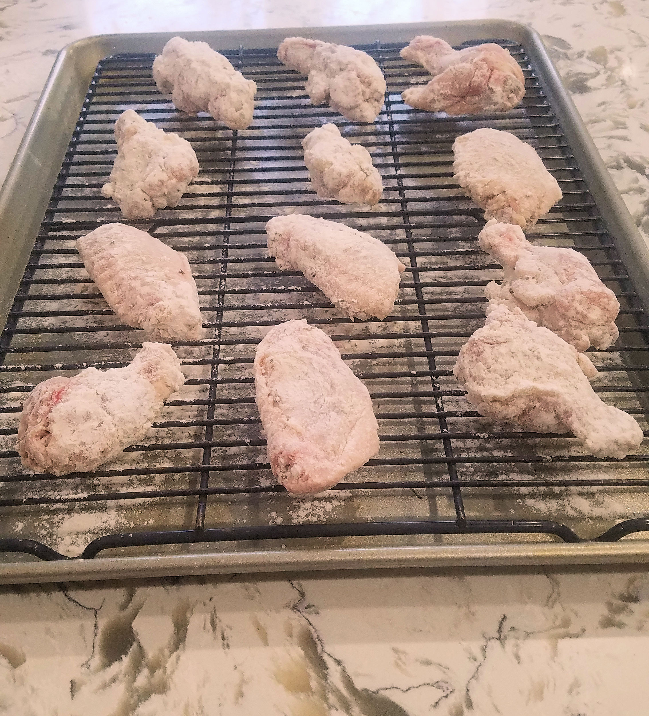 Dredged wings for the Baked Buffalo Wings recipe. The wire rack helps circulate air around the whole wing to make them crispy despite being baked.