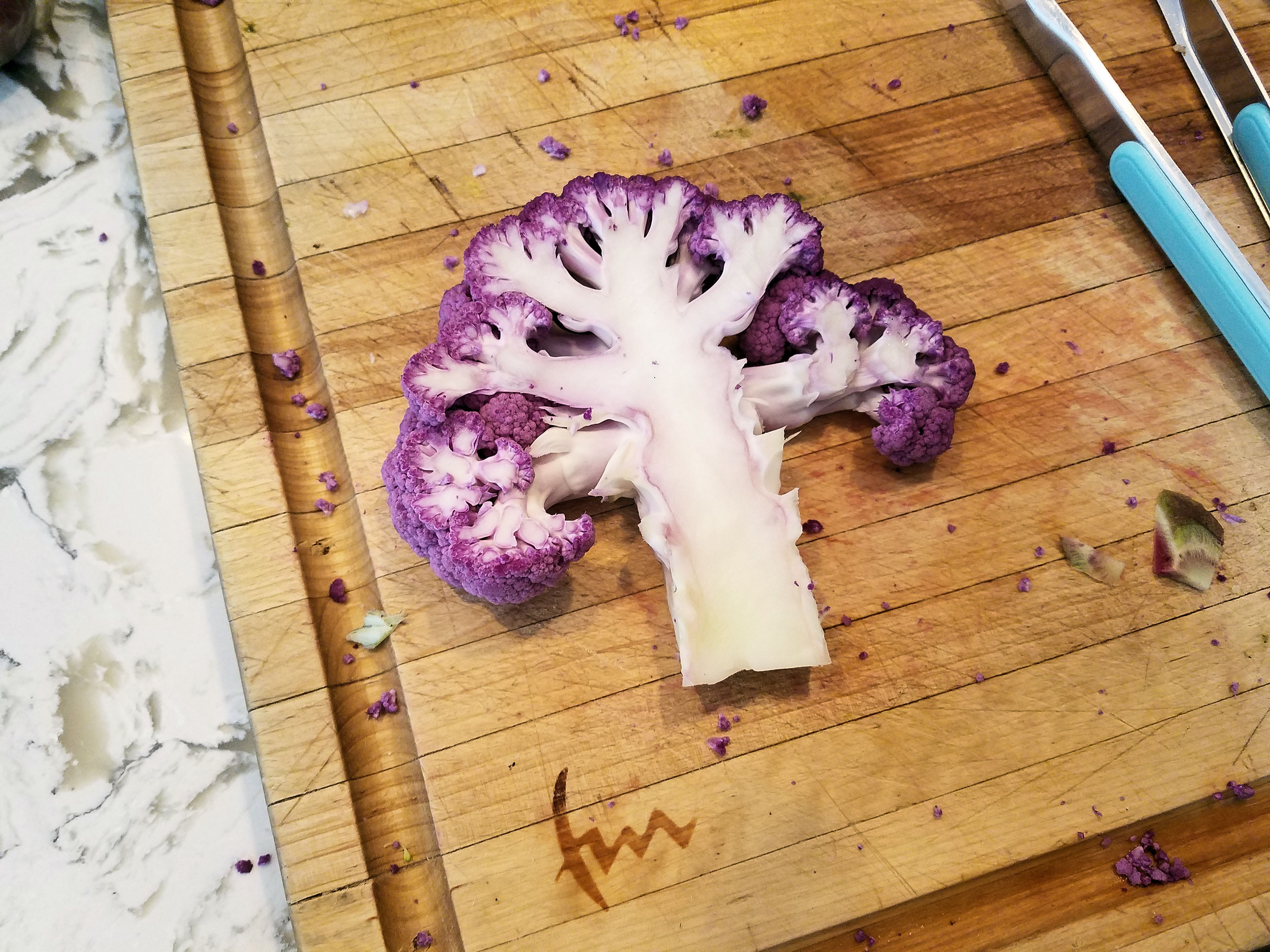 1. Cut the cauliflower to make two “steaks” out of the head (see picture), and trim off any greens.