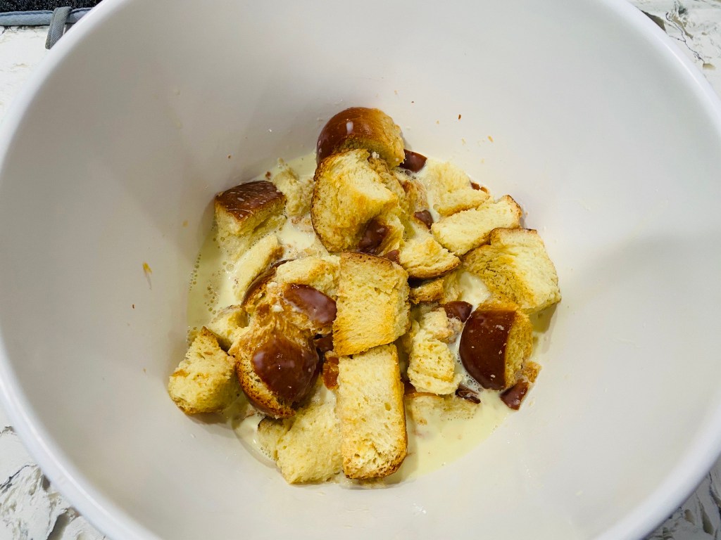 4. Pour the mixture over the bread. Let soak at least 15 minutes up to an hour (if waiting more than 15 minutes, put in the fridge after it cools).
