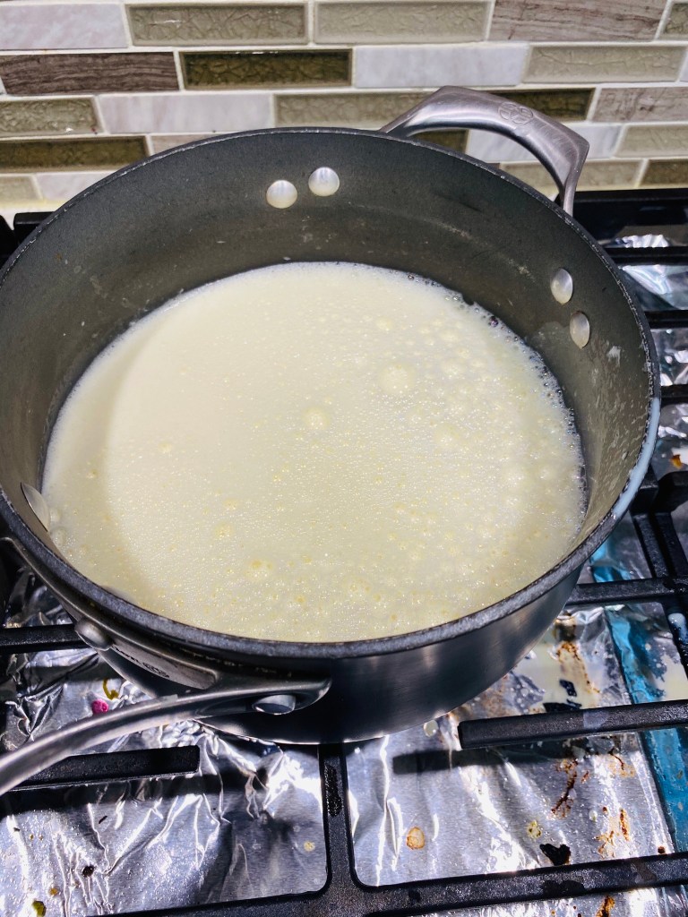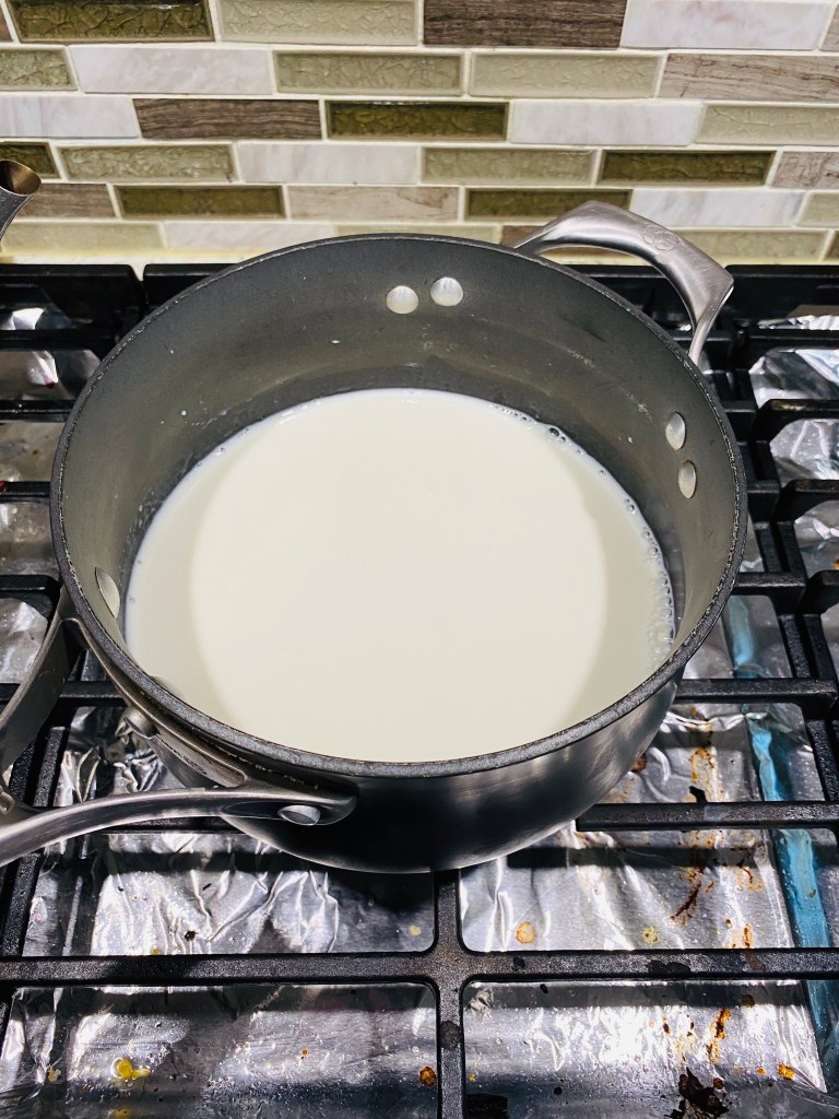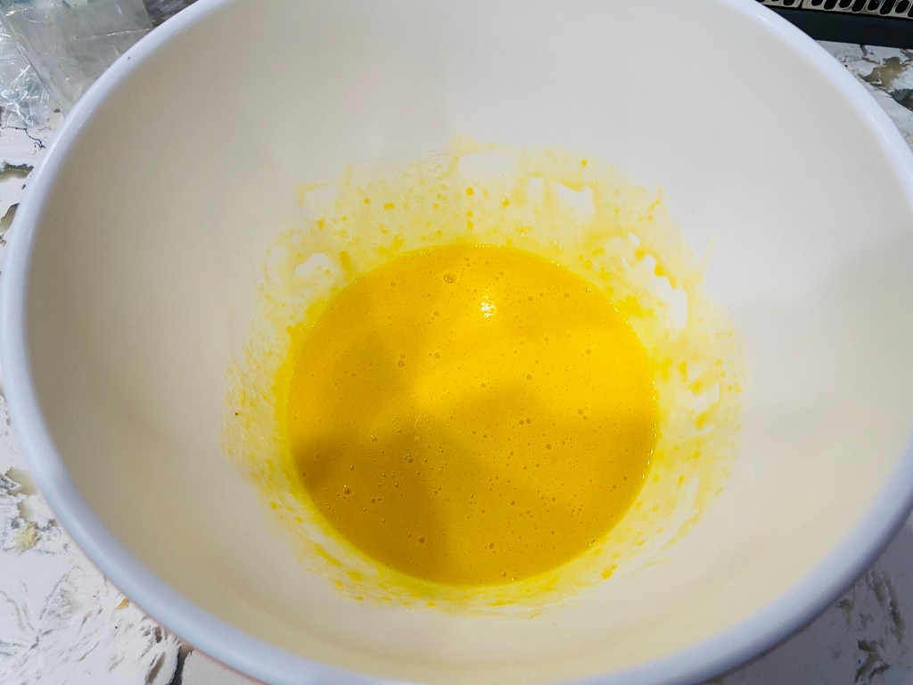 2. Place the cubed bread in a large bowl and set aside. In a small cooking pot, add the milk and half and half, along with the pinch of salt. Bring to a simmer over medium heat, being careful not to scald the mixture. While waiting for the mixture to heat in another large bowl, add the egg yolks and remaining sugar. Beat together until light and fluffy. Once the mixture is simmering (but not scalded), turn off heat. One ladle at a time, whisk the hot mixture into the eggs while whisking to temper the eggs. Repeat until 1/3 of the mixture has been added to the eggs in this fashion, continuing to whisk the entire time to avoid the eggs scrambling. (Tip: if your eggs do scramble at any point, use a fine mesh sieve to retain as much of the custard mixture as you can). Slowly add the remaining mixture to the egg mixture, continuing to whisk until fully incorporated.