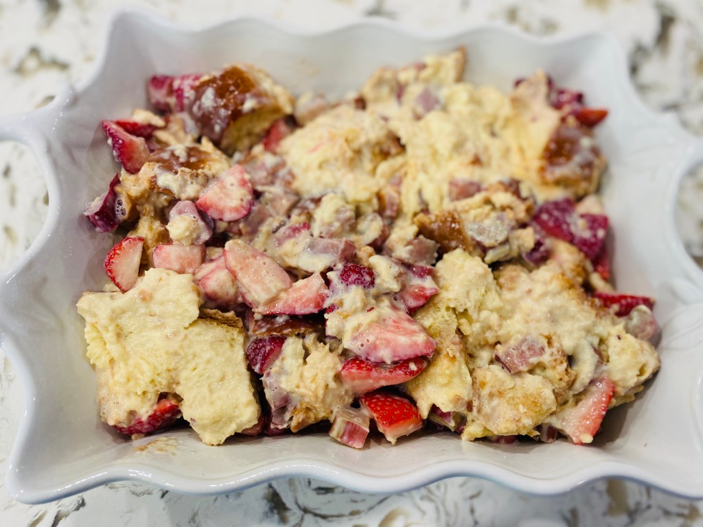 5. Add the strawberry and rhubarb mixture to the bread mixture and gently toss to incorporate thoroughly. Spray a 9 x 13 baking dish with non-stick spray and then add the mixture evenly to the dish. Let sit in the fridge at least one hour, covered, up to overnight.